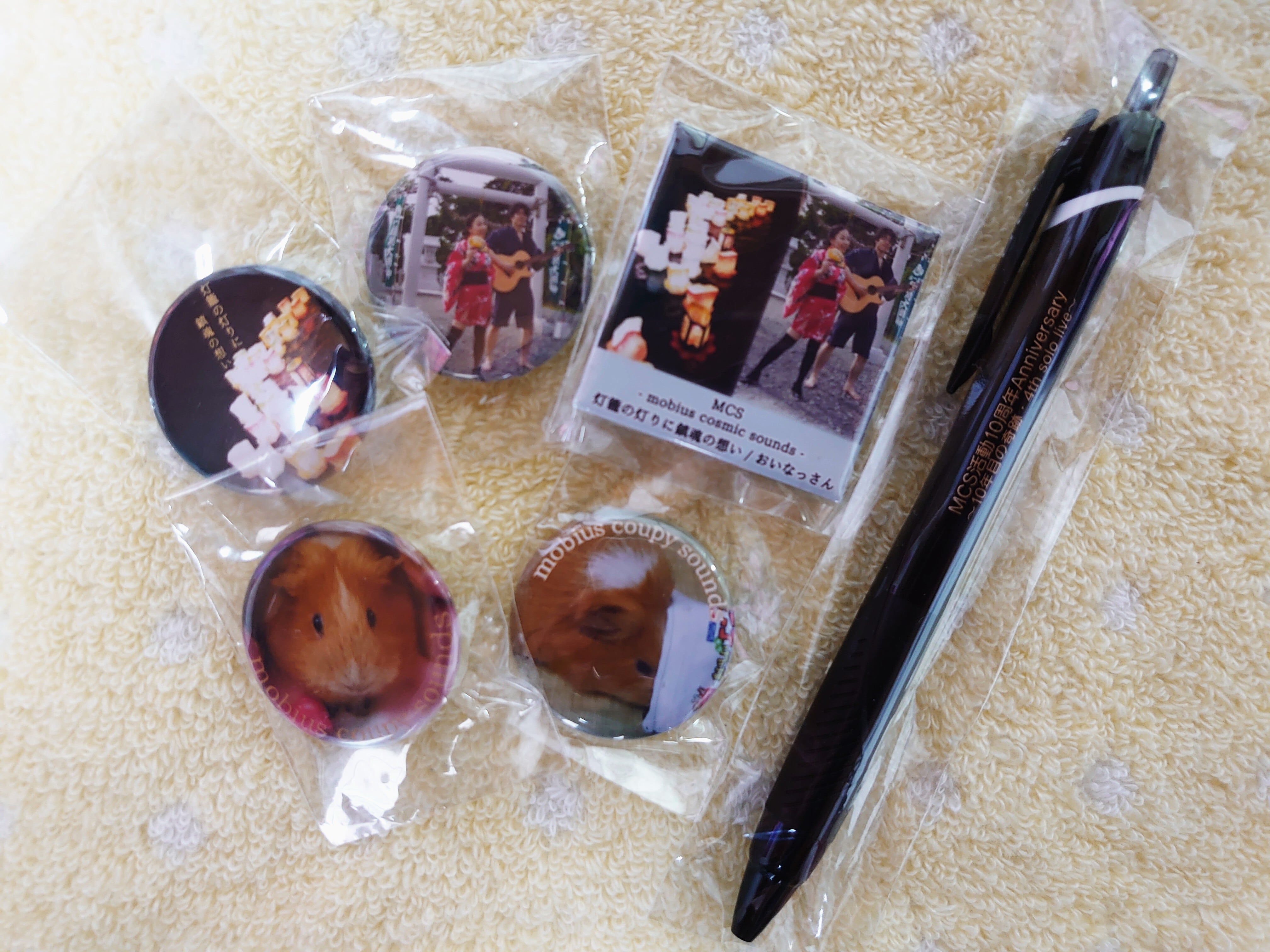 CDリリース時の記念缶バッチと、2019年活動10周年Anniversary記念ボールペン、